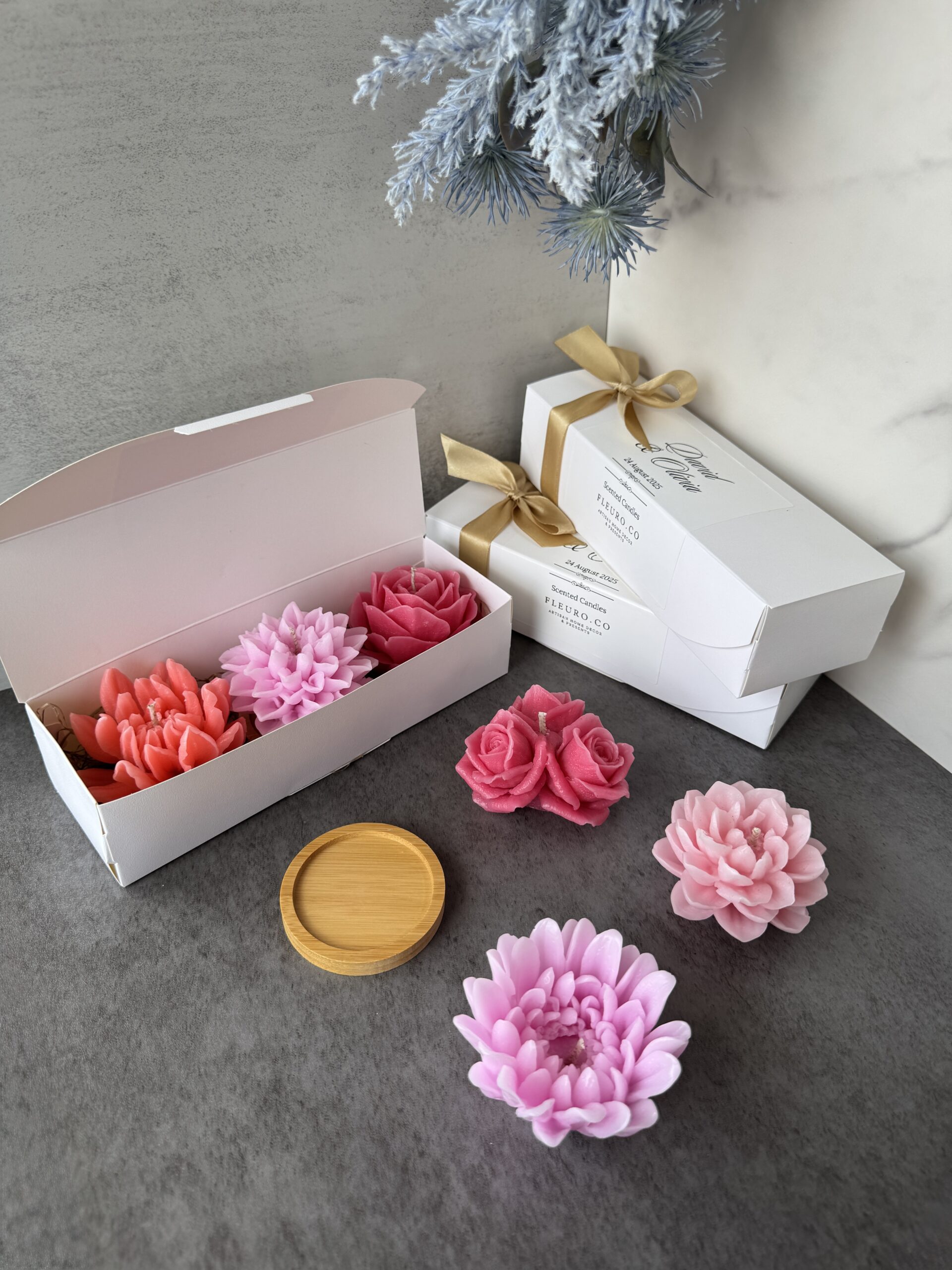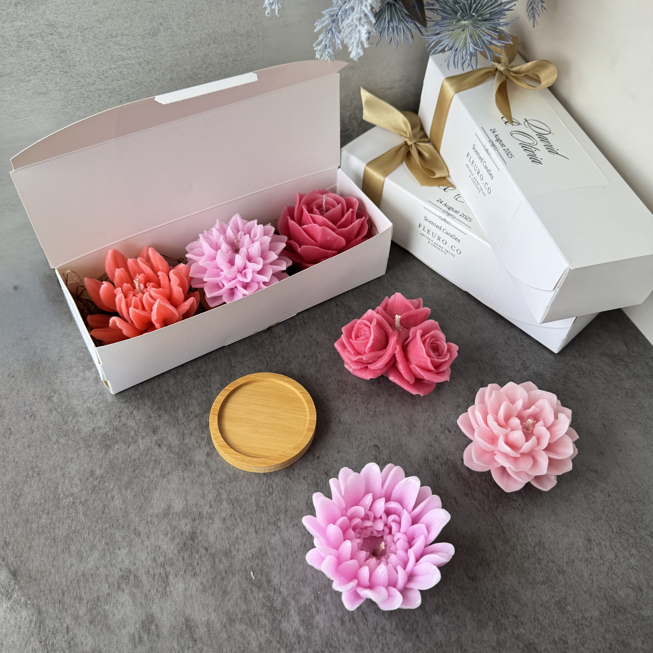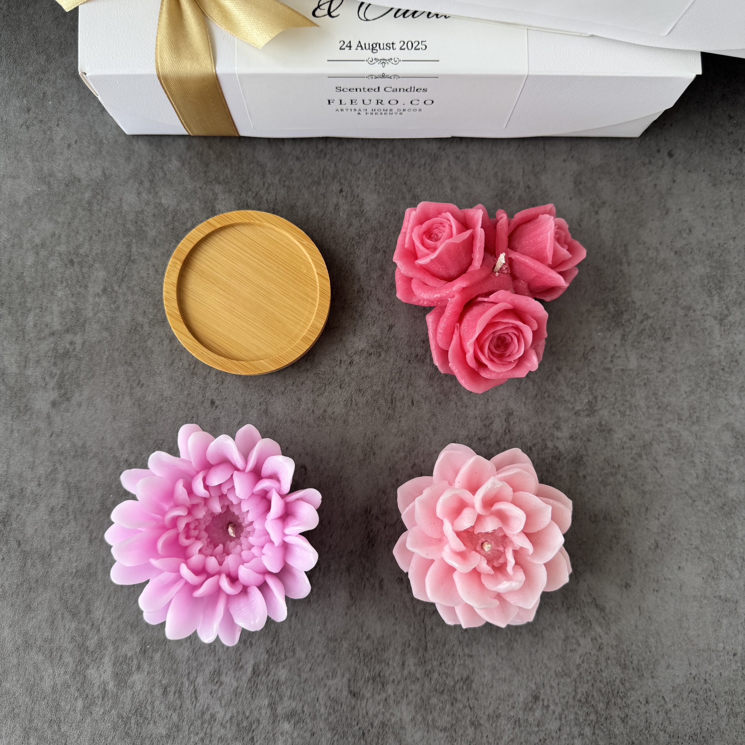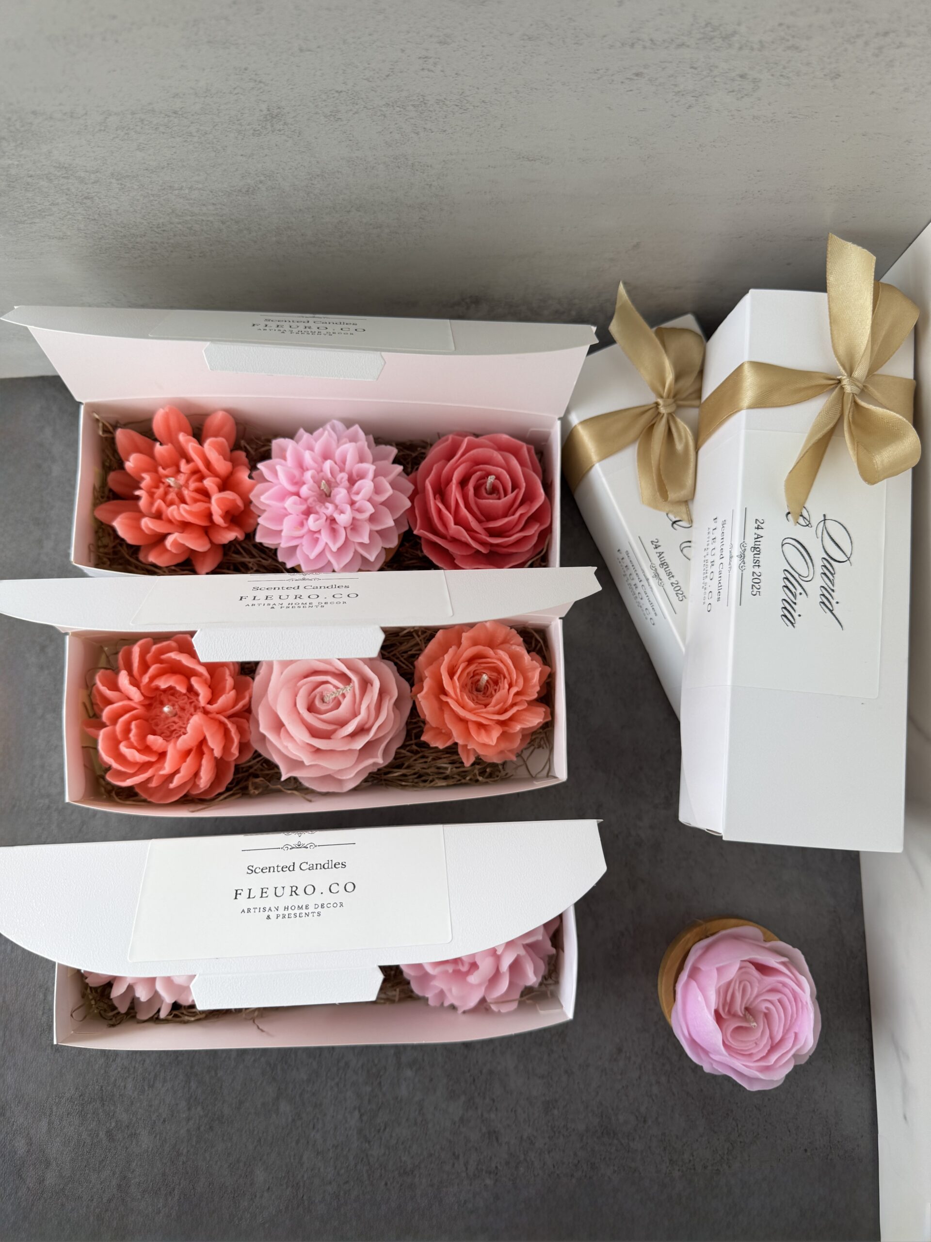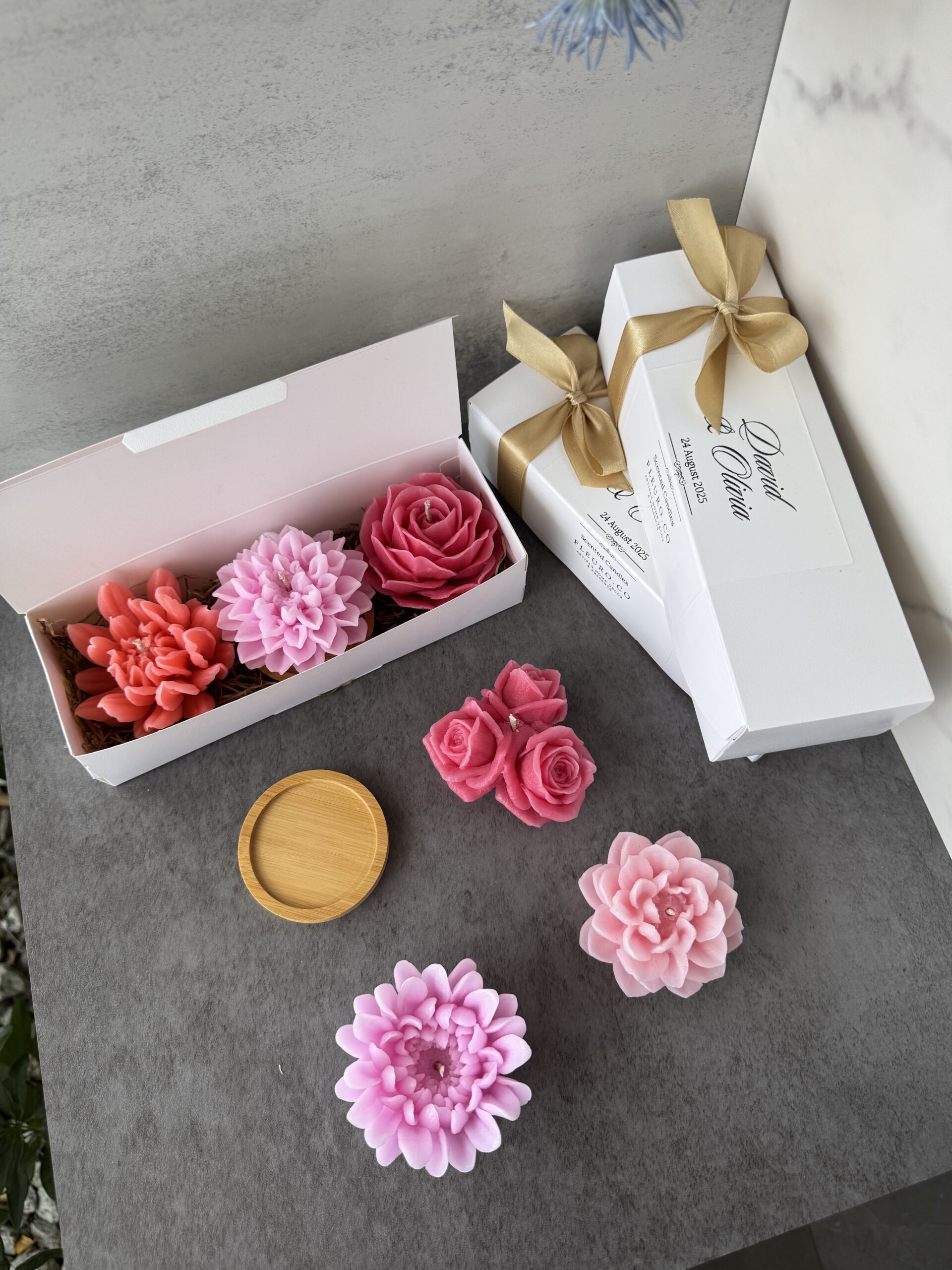A charming set of three artisan flower-shaped candles, each 65 g, arranged together with a cement coaster. This set makes a meaningful surprise for weddings, door gifts, or corporate events, offering both elegance and practicality.