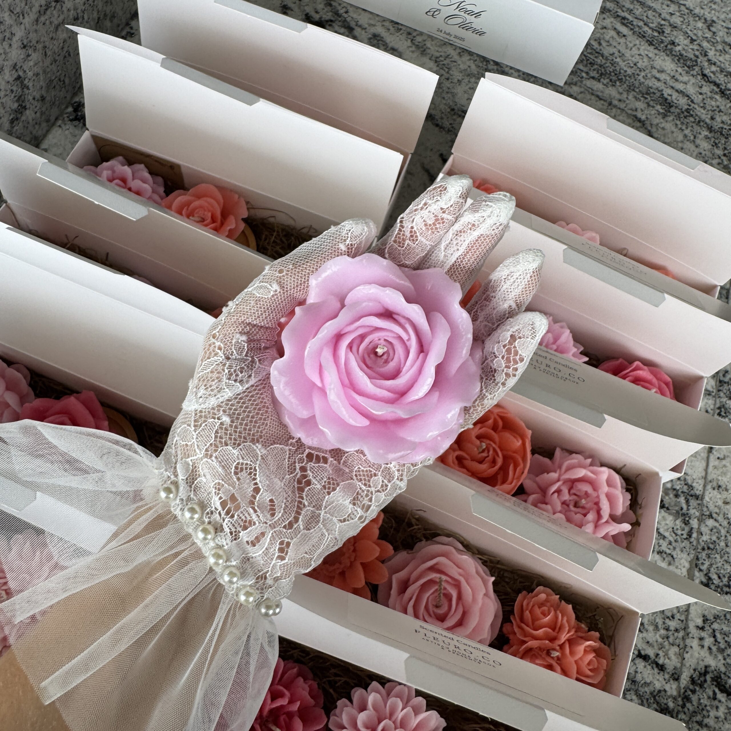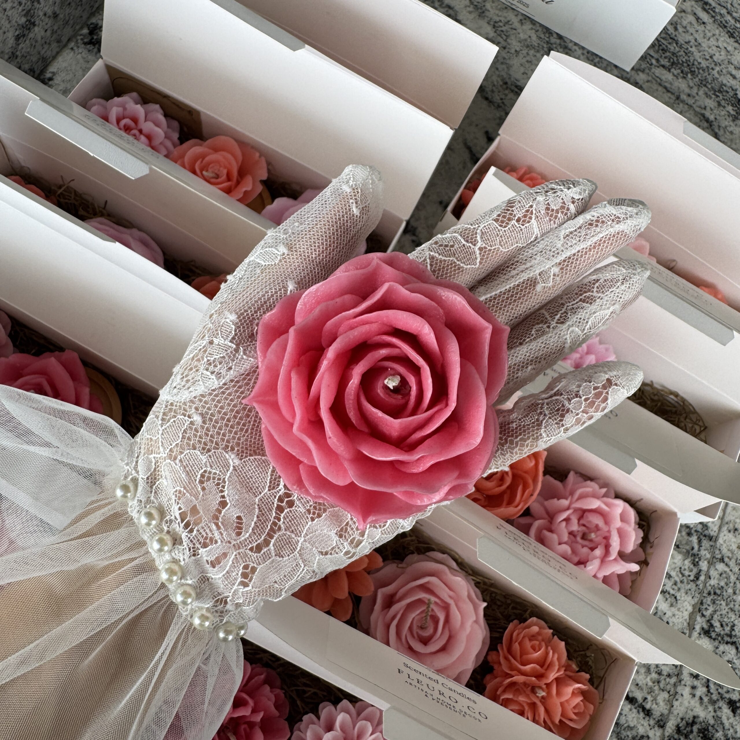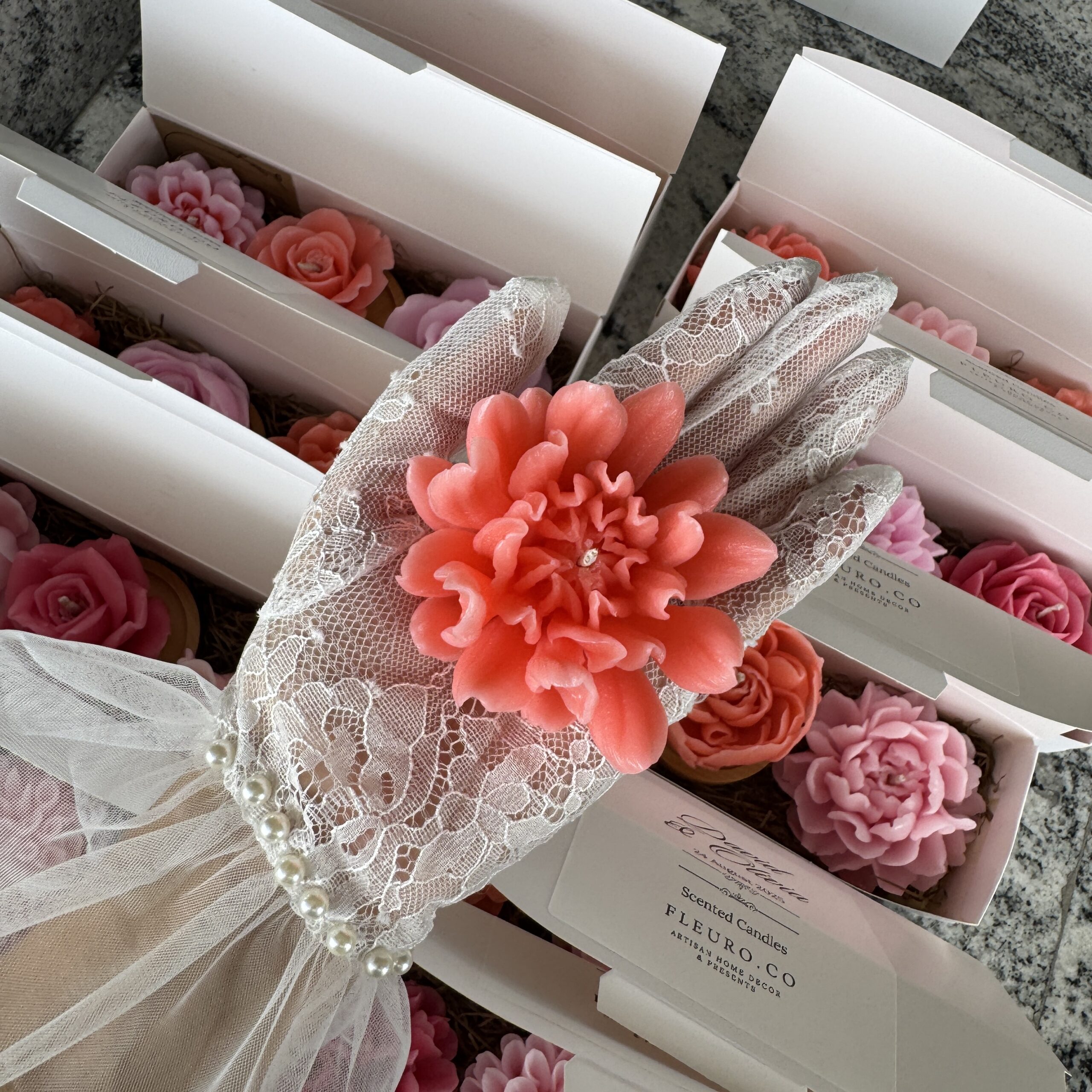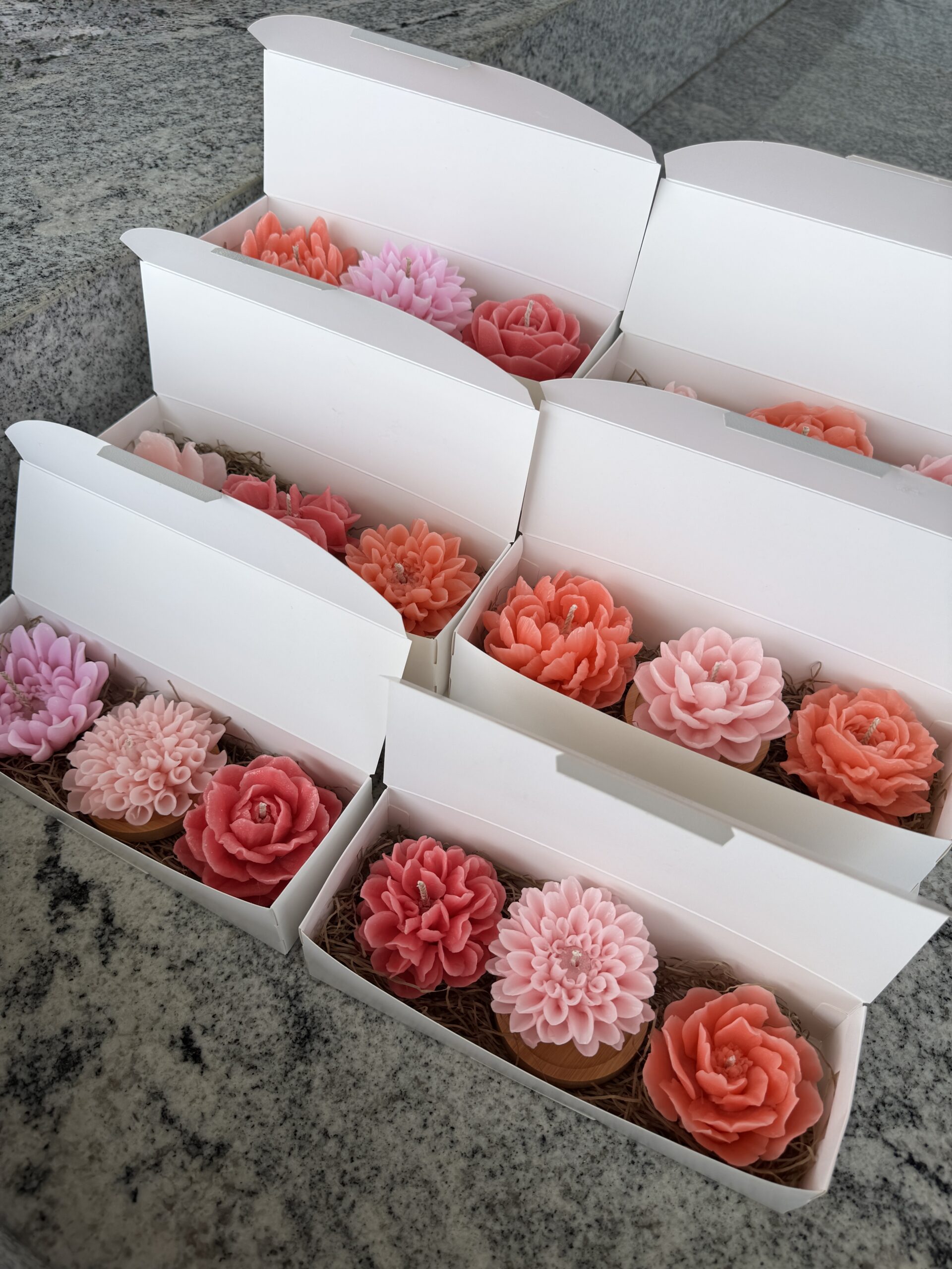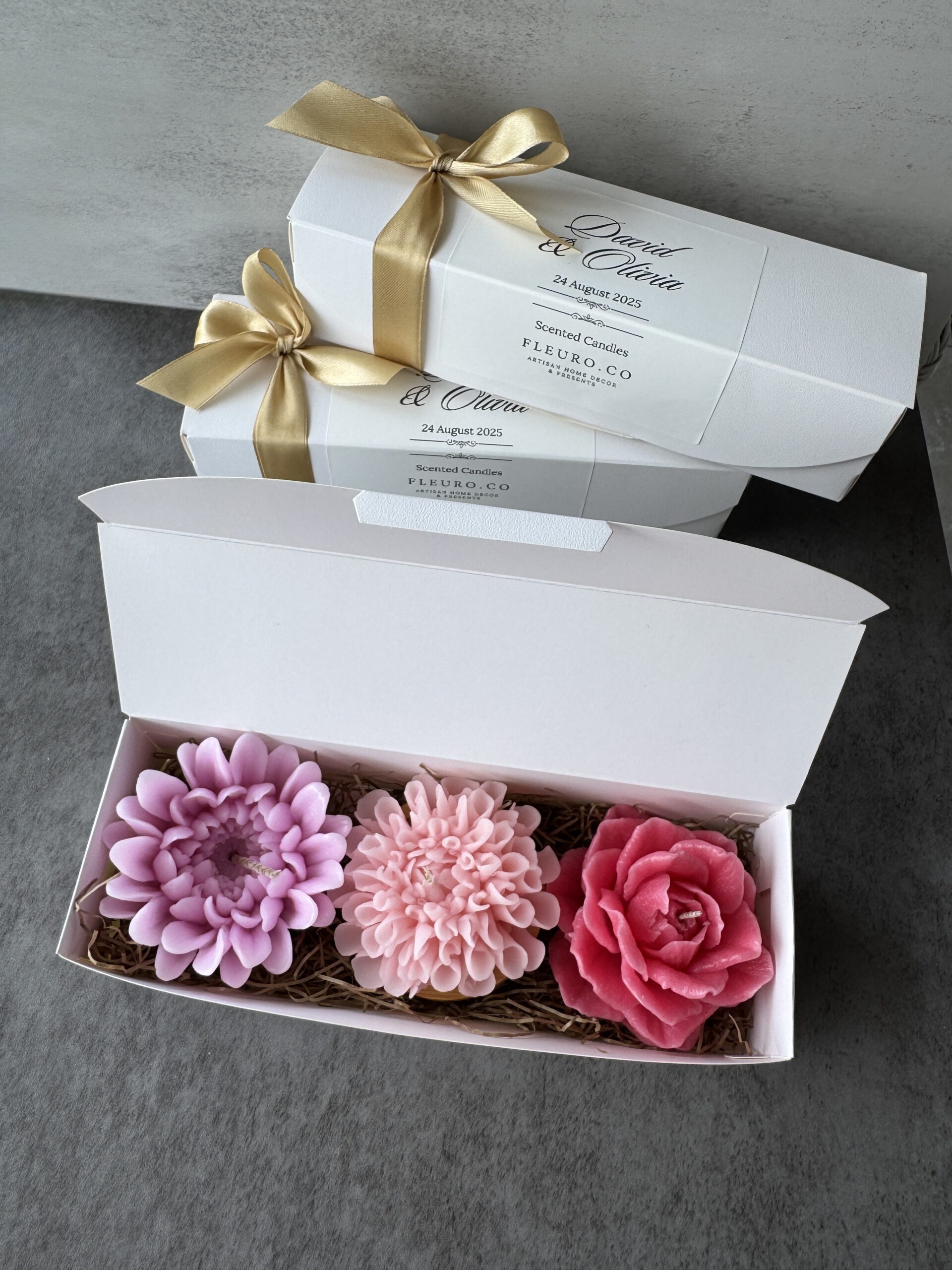 A charming set of three artisan flower-shaped candles, each 65 g, arranged together with a cement coaster. This set makes a meaningful surprise for weddings, door gifts, or corporate events, offering both elegance and practicality.