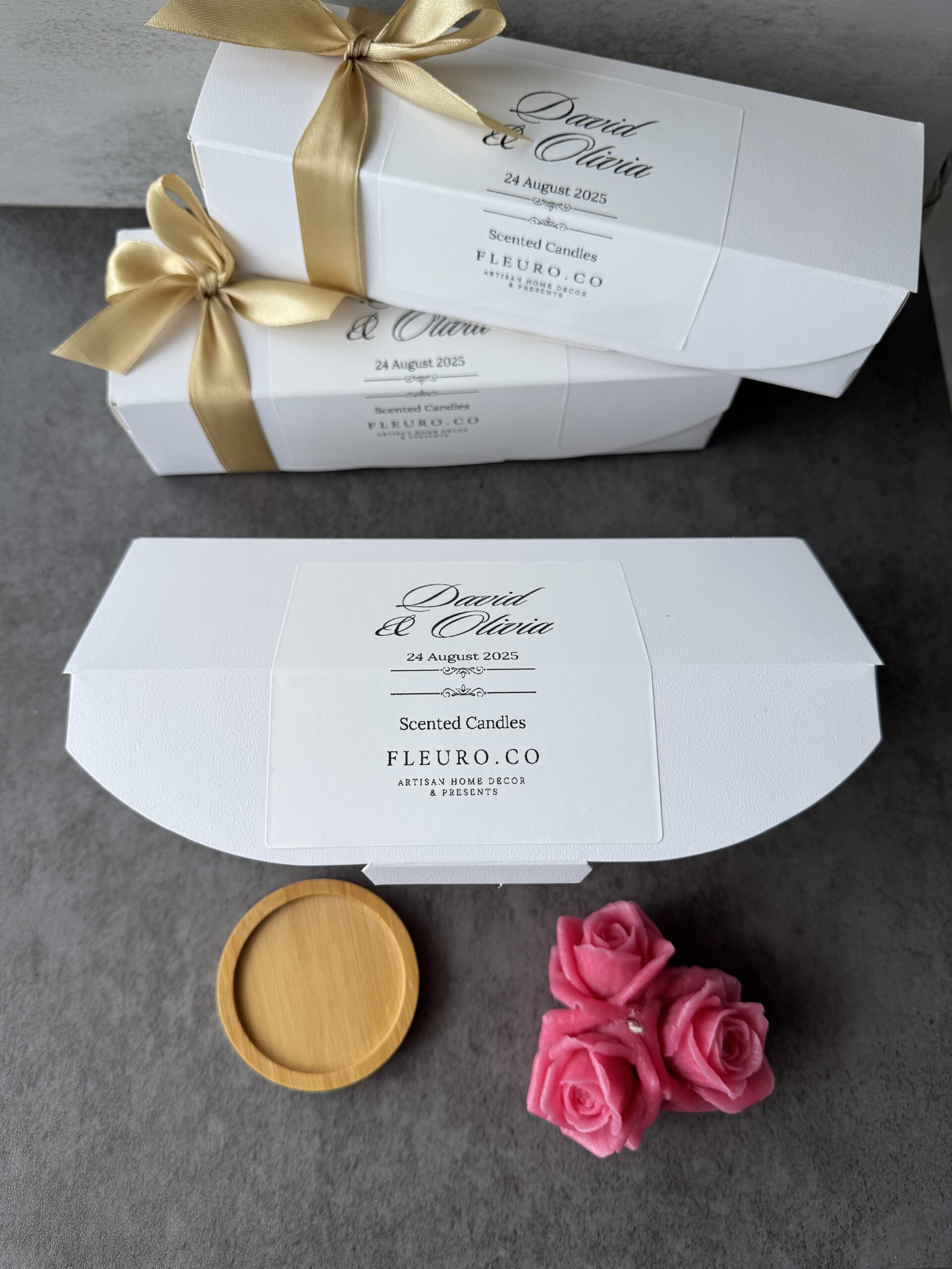 3-candle set with coaster, perfect for events or gifts. Custom label with your logo or message adds a personal touch guests will love.