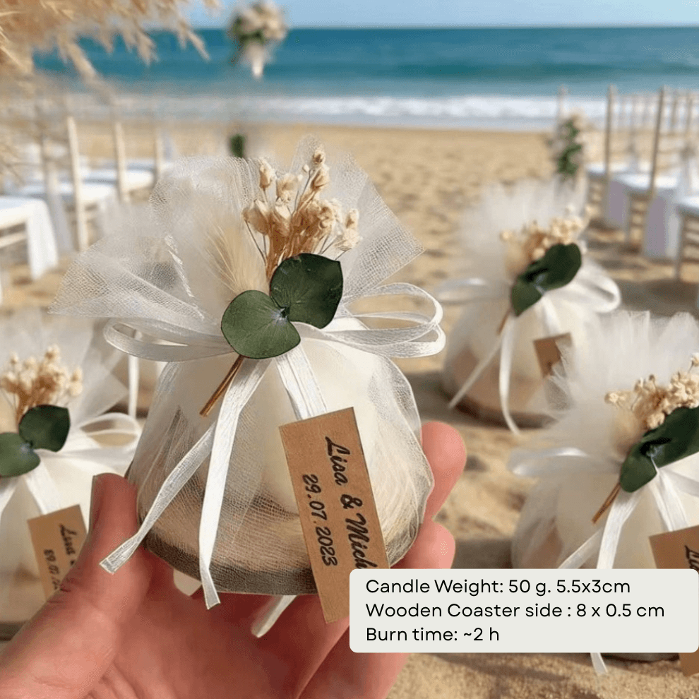 Add a touch of rustic elegance to your tables with our Rose M wedding favour candle (50g) beautifully presented on a natural wooden coaster. Handcrafted to be a functional and charming keepsake your guests will love.