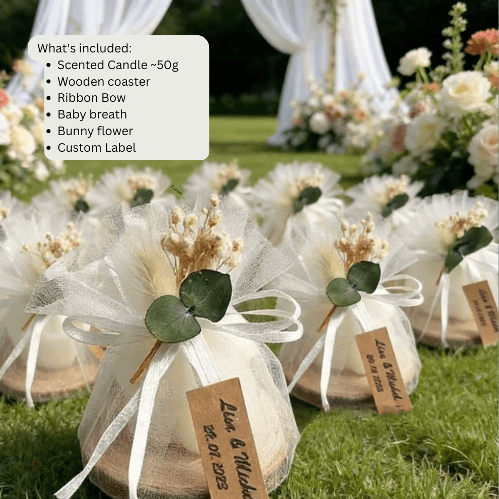 Wedding Favour Rose Scented Candle on Wooden Coaster – Custom Ribbon, Flower & Label, Personalised Rustic Wedding Gift, Guest Keepsakes