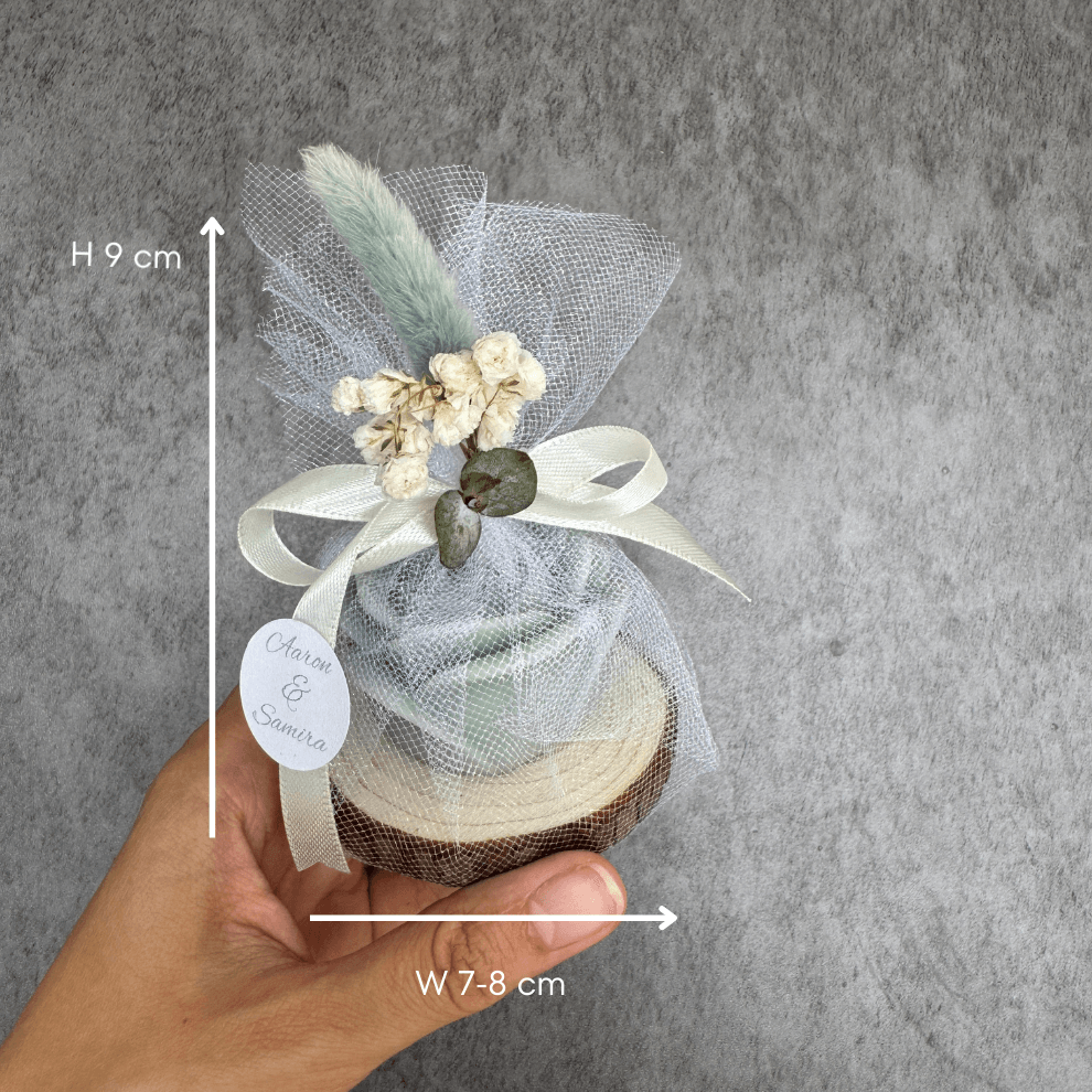 Description: Add a touch of rustic elegance to your tables with our Rose M wedding favour candle beautifully presented on a natural wooden coaster. Featuring custom ribbon, preserved baby breath, and a personalised label – perfect for woodland or rustic-themed weddings. Handcrafted to be a functional and charming keepsake your guests will love.