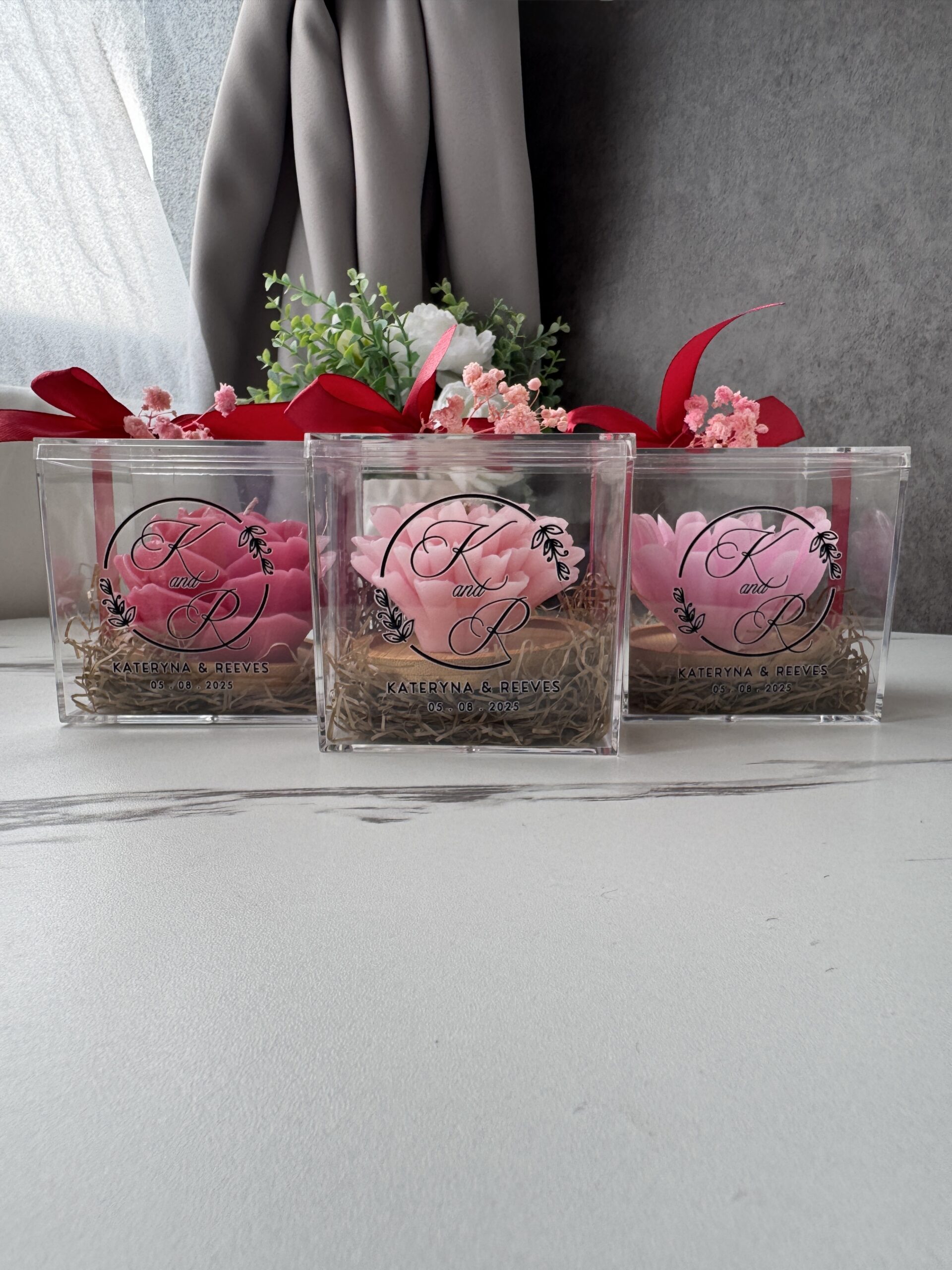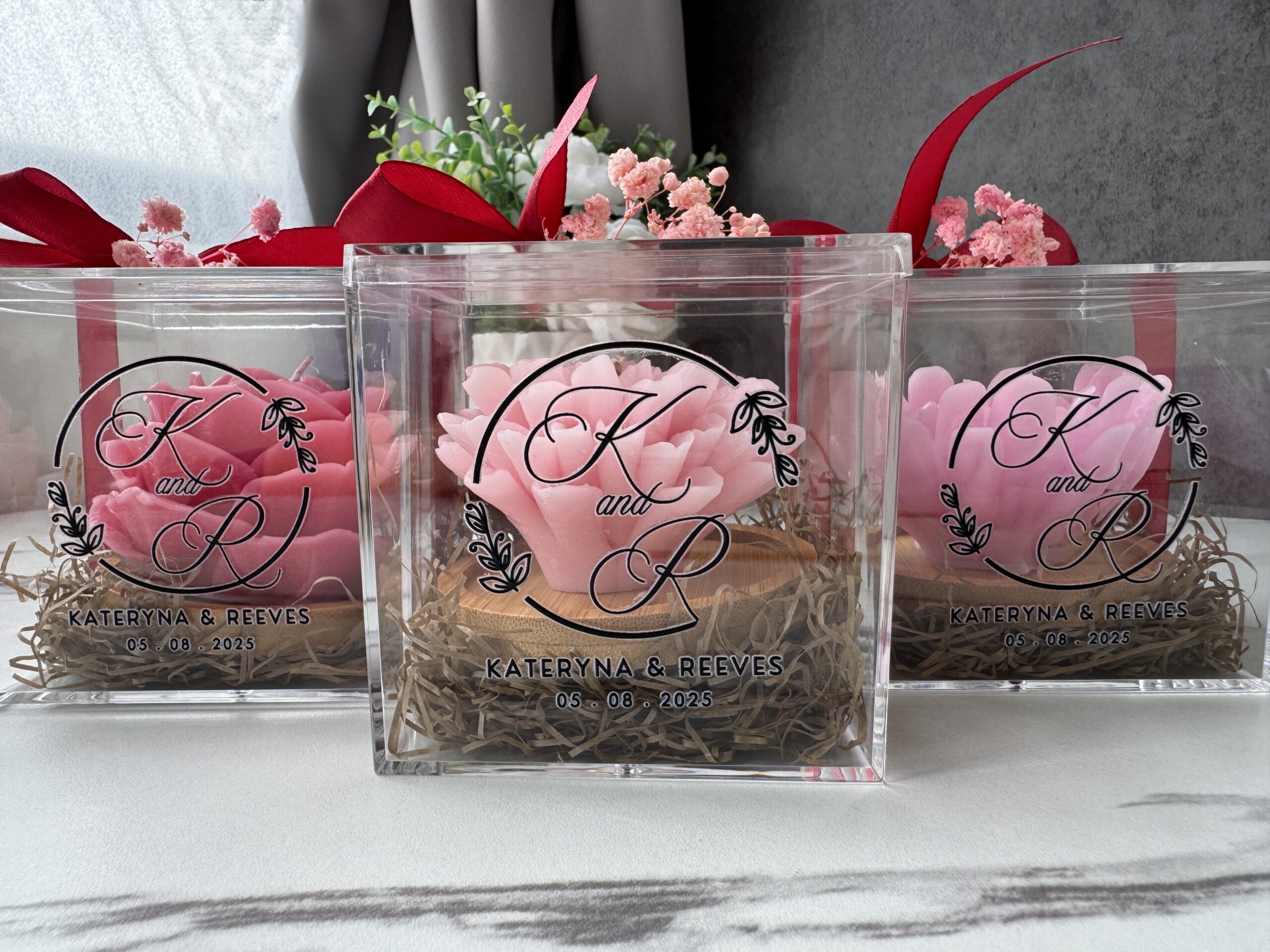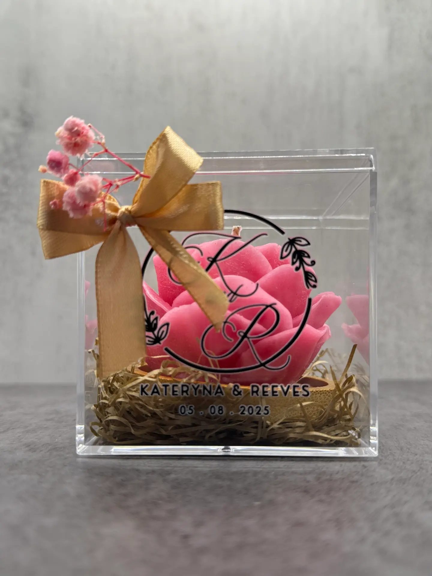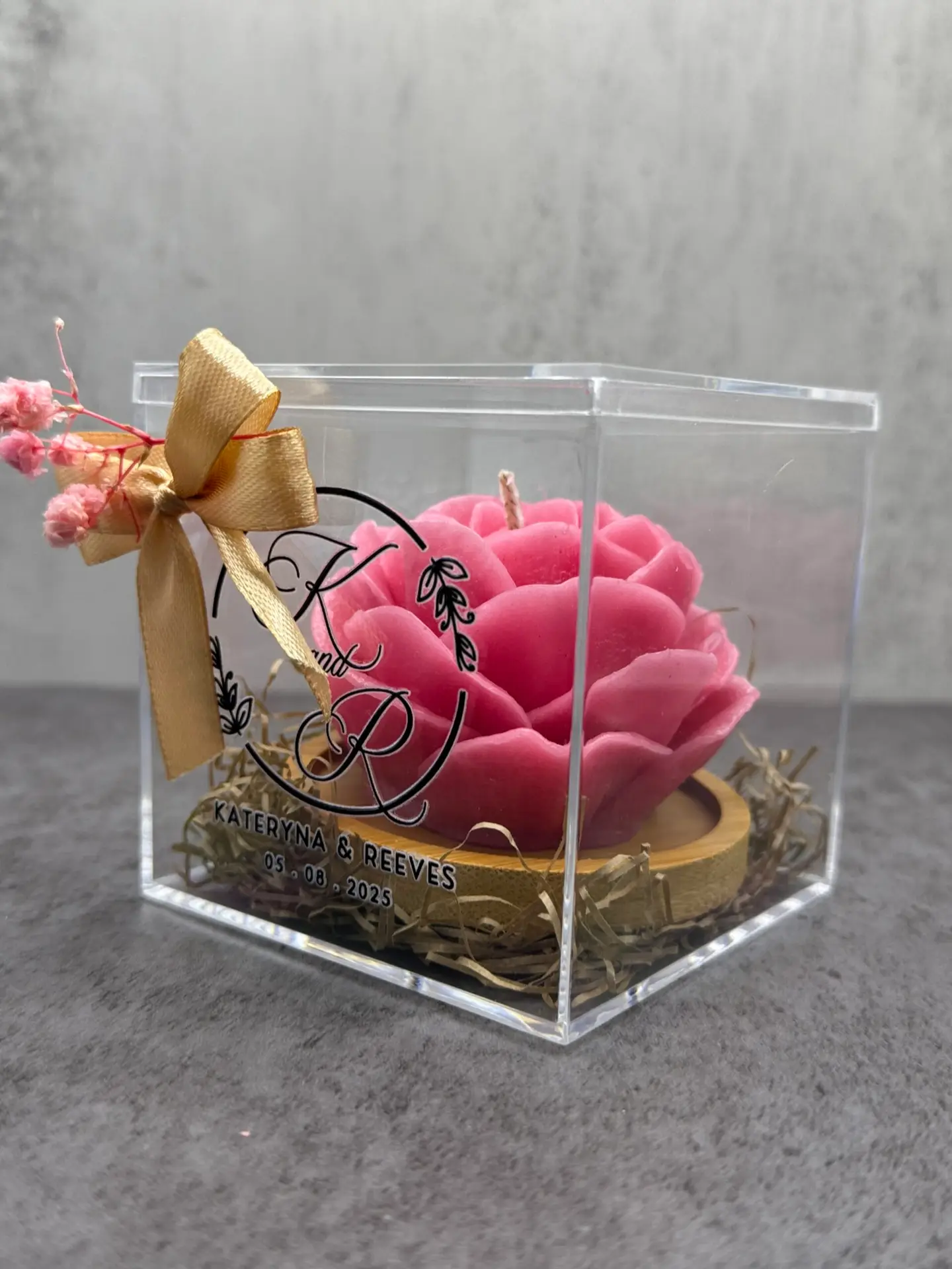 Artisan flower-shaped beeswax candle with wooden coaster in an acrylic box. Perfect for weddings, gifts & events