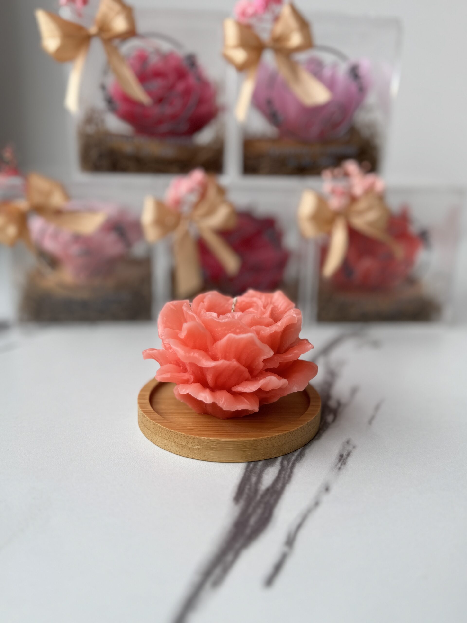 An artisan flower candle crafted from natural beeswax, paired with a wooden coaster and packed in a transparent acrylic box. The clear design makes the flower details visible from every angle, surprising the receiver before they even open it.