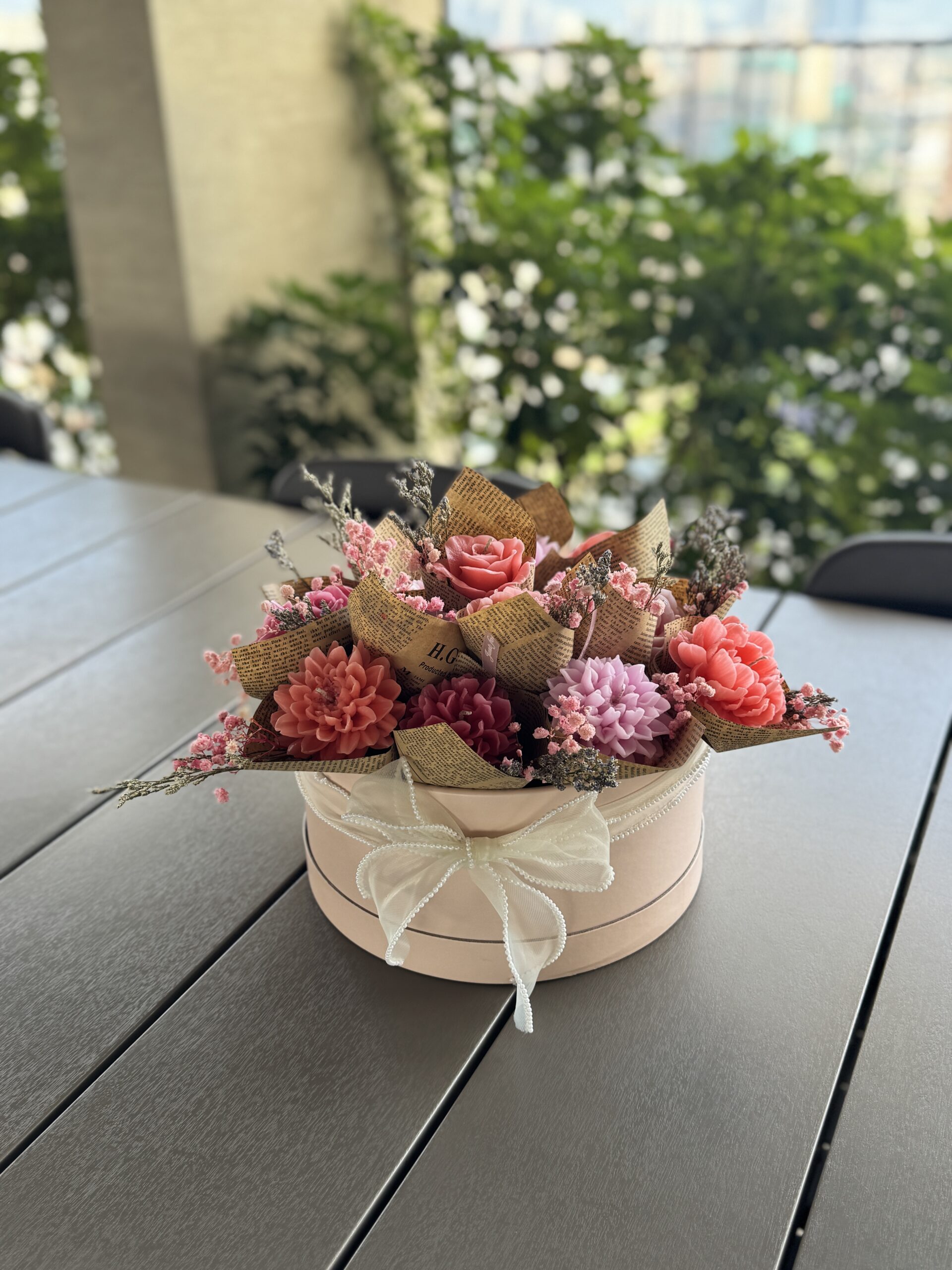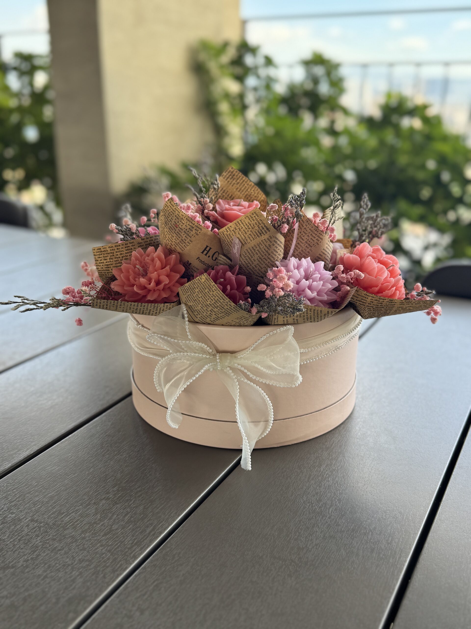 Flower Box Size M 25.5cm x 13cm (fits ~14 candles). Available color: Light Pink, Wine Red. Flower Box Size L (fits ~28 candles). Available color: Pink, Red, Black.