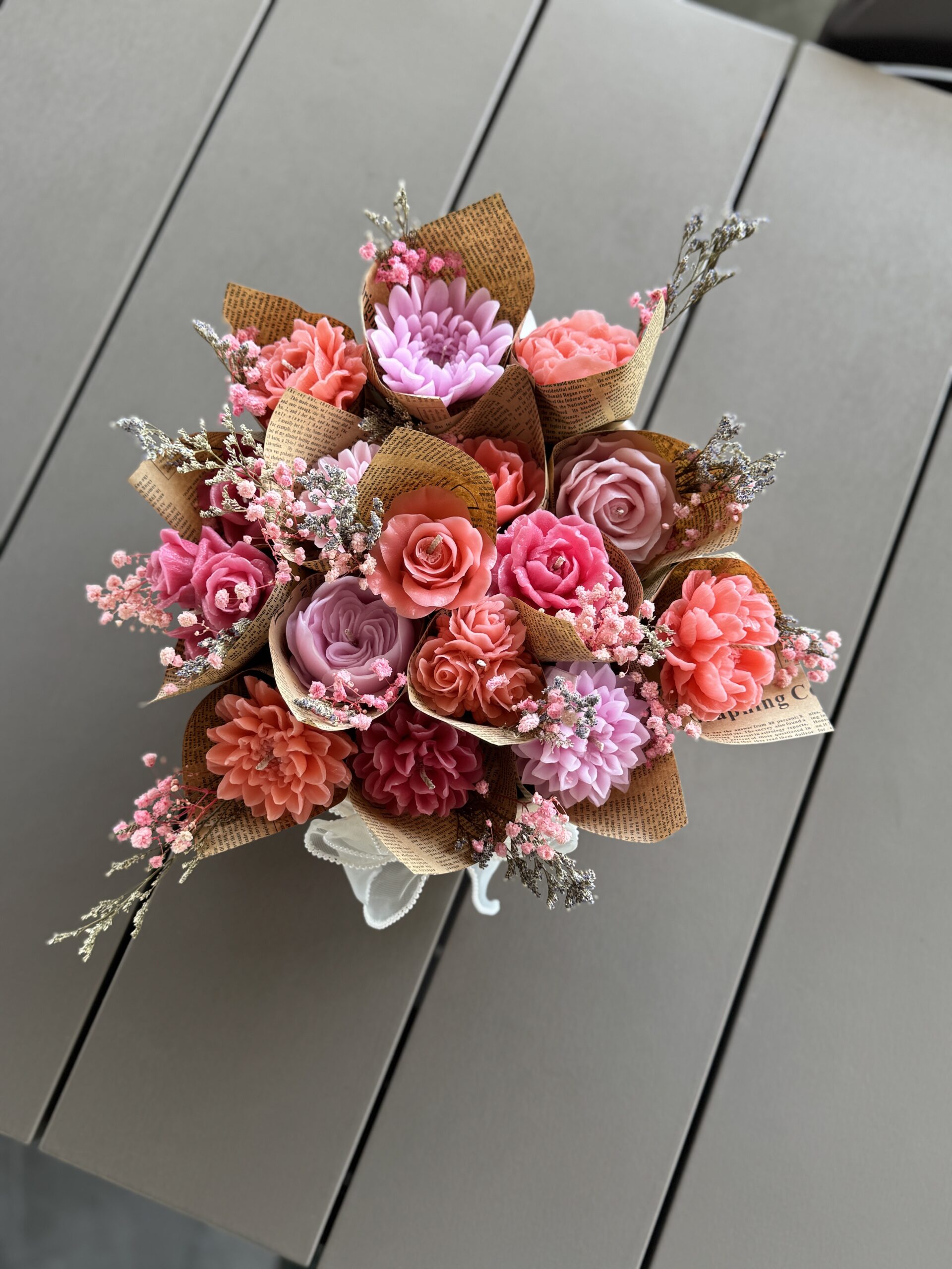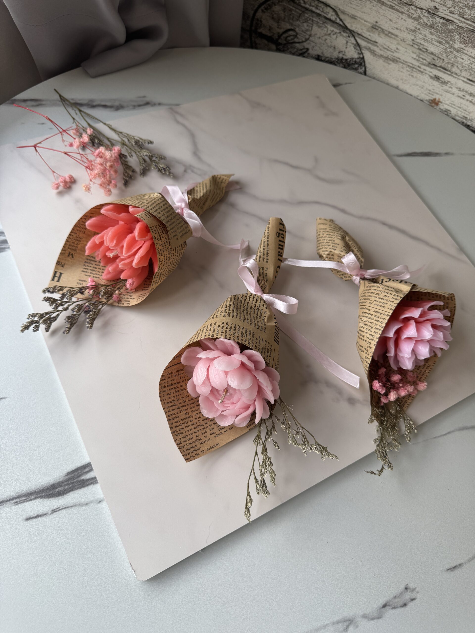 An artisan flower-shaped scented candle, individually wrapped with ribbon and preserved flowers. A thoughtful surprise for weddings, door gifts, corporate events, or baby showers. (Note: This version comes without a coaster.)