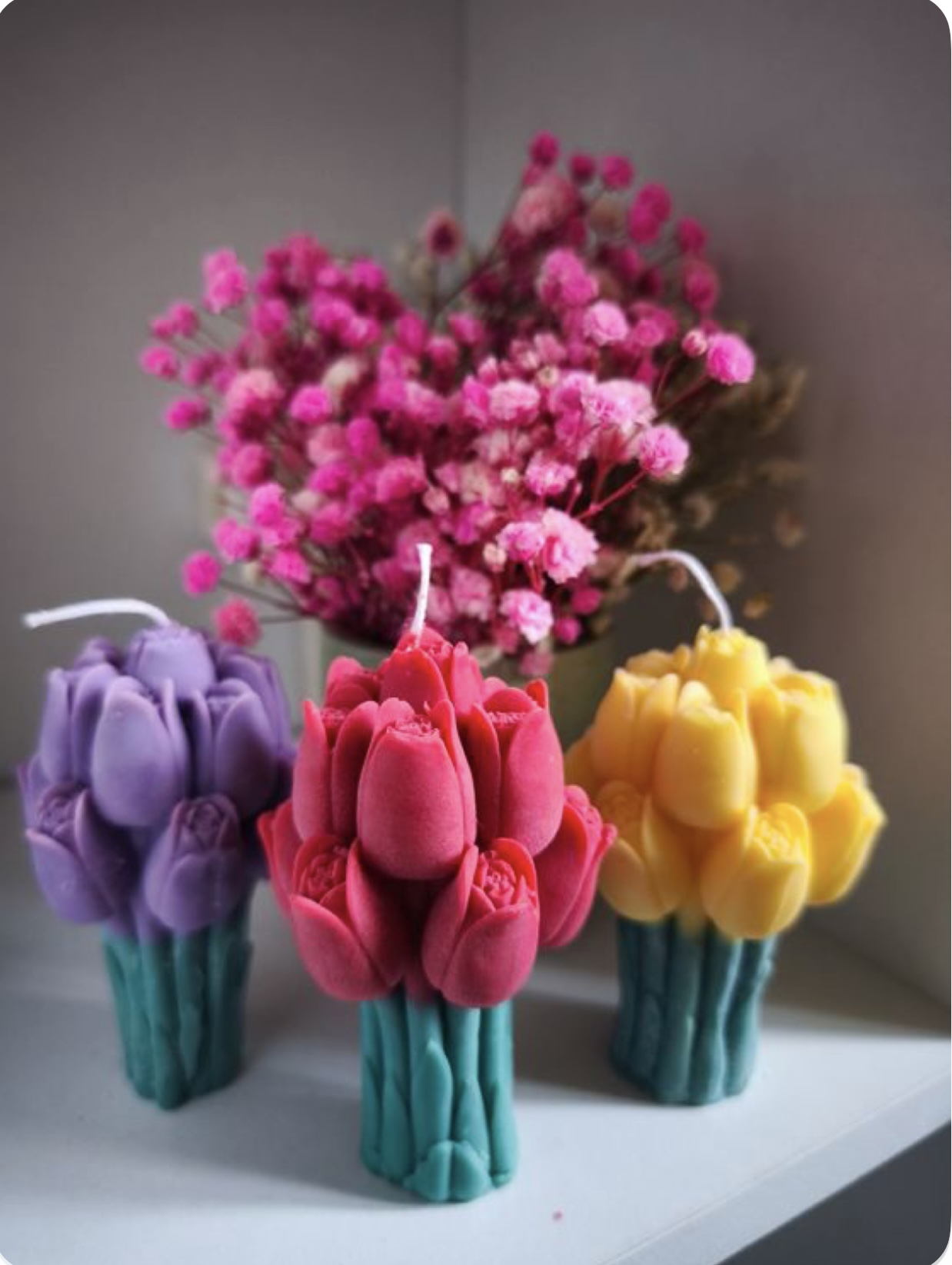 The Tulip Bouquet candle features a soft, gentle floral design inspired by fresh spring blooms. Handcrafted with delicate details, this candle brings a calm and elegant touch to any celebration or personal space. Finished with a ribbon bow and a custom label, it is thoughtfully presented and ready for gifting.