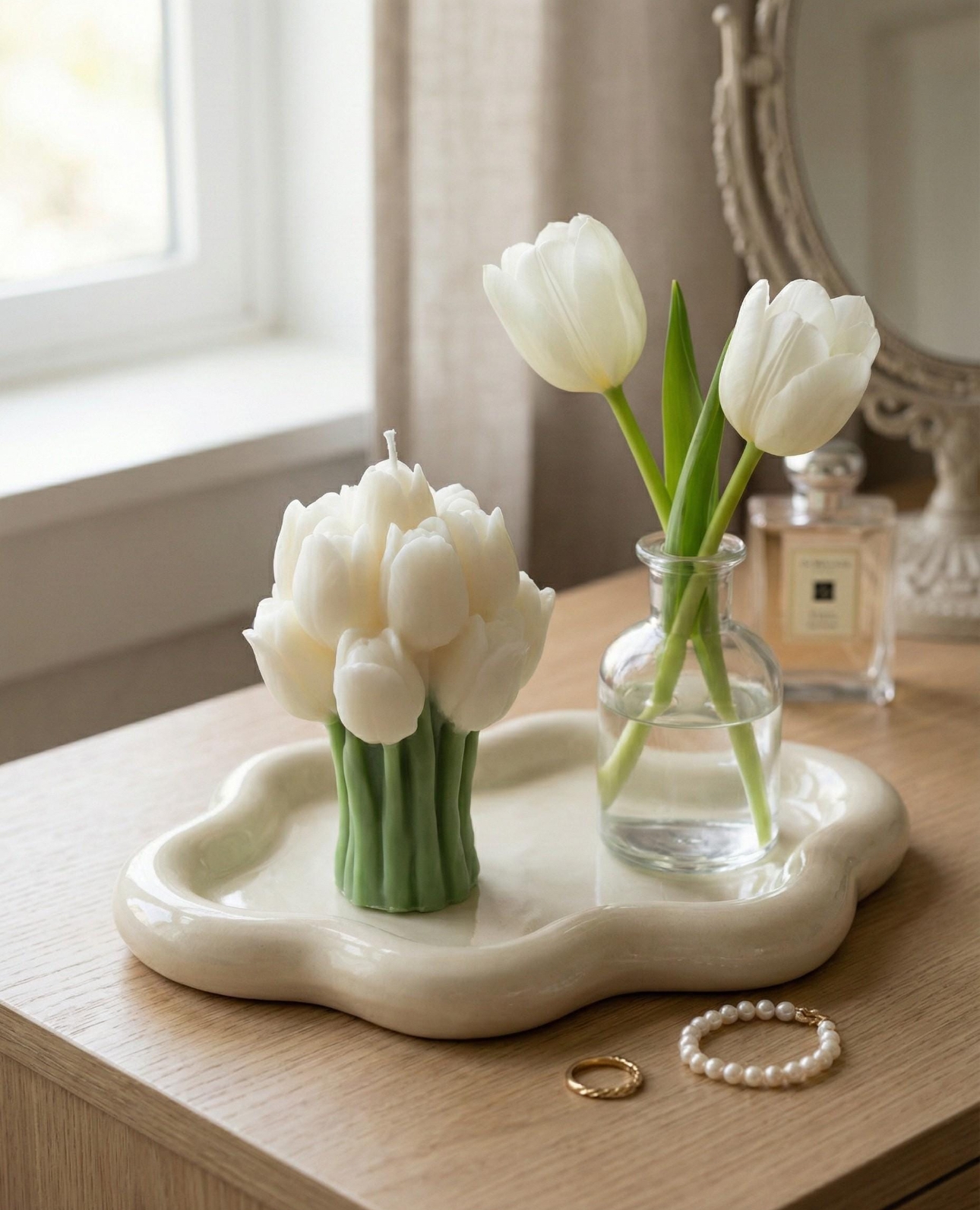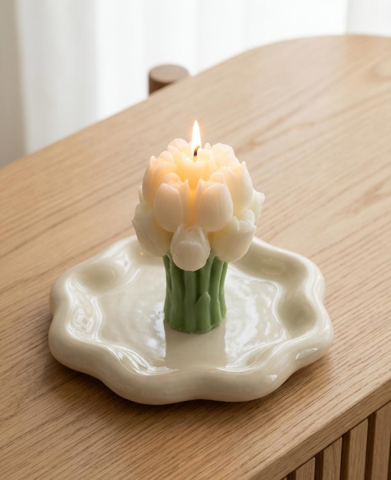 A gentle tulip bouquet–inspired candle with a soft floral design, finished with a ribbon bow and custom label. Acrylic name tag available as an add-on (RM1).