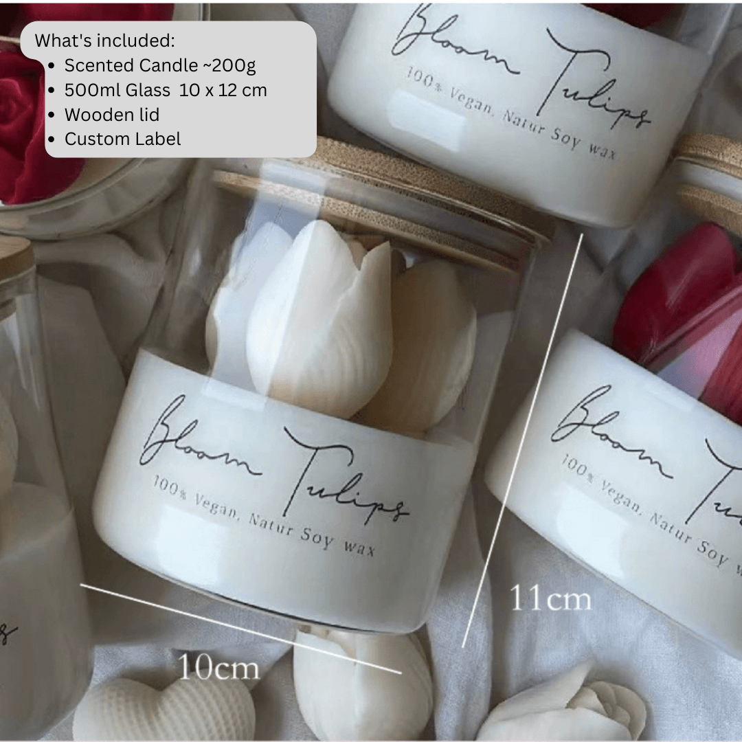 Luxury Tulip wedding favour candle (200g) in a premium 500ml glass jar. Features a custom label for a bespoke finish. Handcrafted, high-quality keepsakes perfect for grand wedding celebrations.